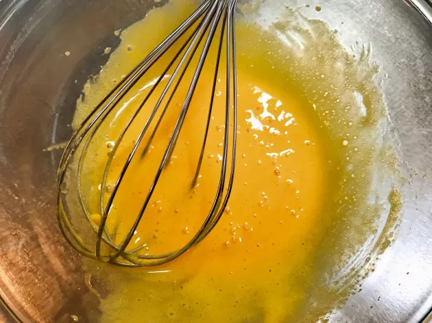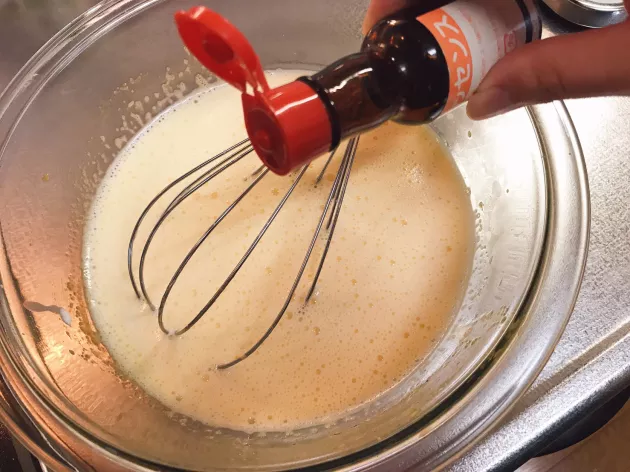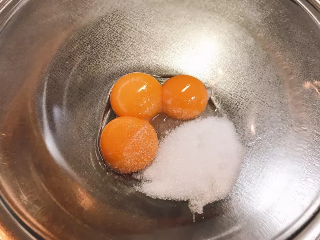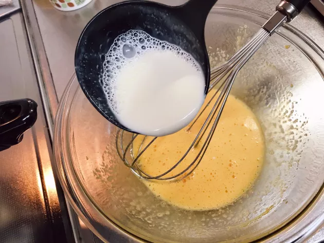温めたクリームを、卵黄のボウルに少しずつ入れて、その都度よく混ぜます!