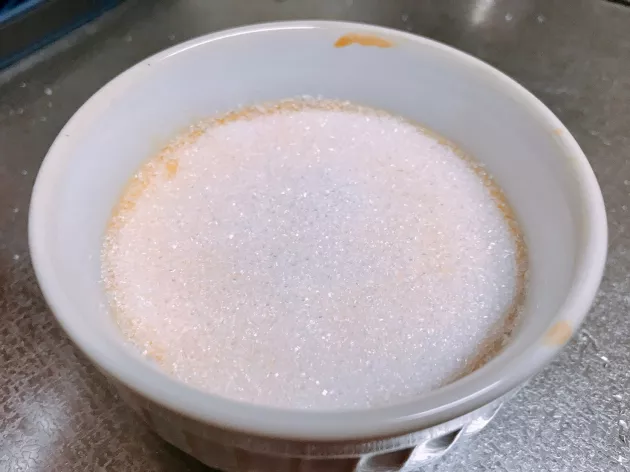 プディングの上にグラニュー糖を敷き詰めます。本来はここからガスバーナーで表面だけ焼いていくのですが、バーナーがないので、トースターで焼いてみました。