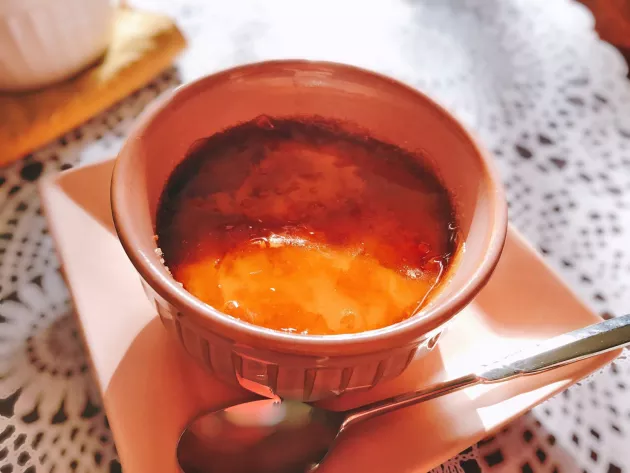 憧れたようにスプーンでコンコンと軽くたたいておこげを割り、下のプディングと一緒にいただきます。