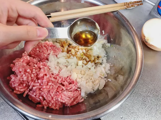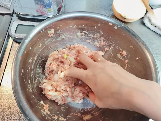 玉ねぎをみじん切りし、ひき肉と一緒にボウルに入れます。パン粉、ウェイパー、醤油、砂糖、ごま油、片栗粉を入れて手で混ぜます。