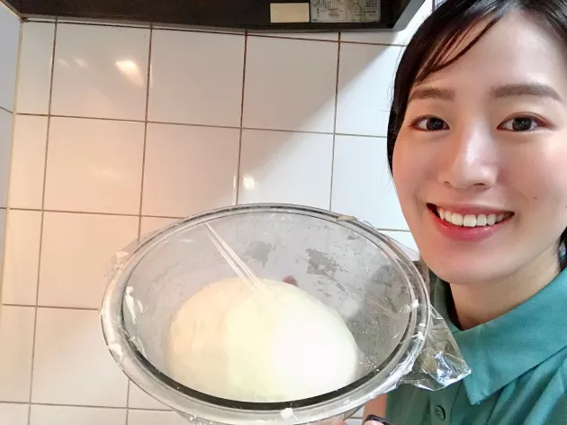生地の発酵が終わり、肉だねをちょうどいい大きさに丸めたらいよいよ包んでいきます。