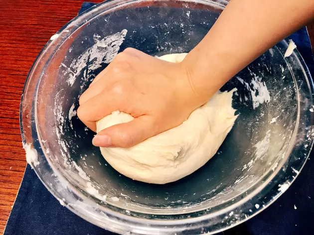 纏まってきたら手でしっかり捏ねていきます。表面が滑らかになって手にくっつかなくなってきたら、OK!
