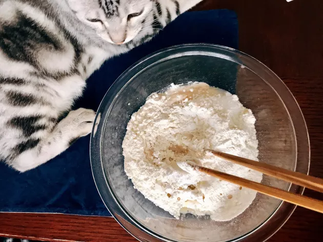 まずは皮の部分を作ります。薄力粉、強力粉、ドライイースト、ベーキングパウダー、砂糖、サラダ油をボウルに入れ、少しずつ水を入れながら混ぜていきます。