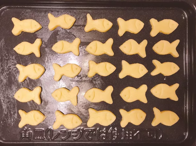 バターを塗った鉄板に並べ、スプーンと竹串で魚の模様をつけます。