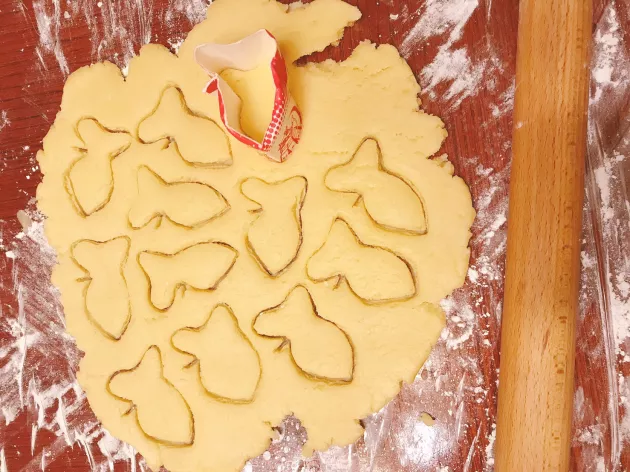 麺棒で薄く伸ばしたら、牛乳パックで作ったお魚の型で型抜きをしていきます。