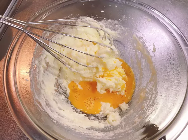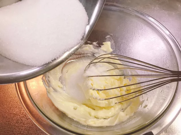 グラニュー糖を入れたら白っぽくなるまでさらに混ぜます。