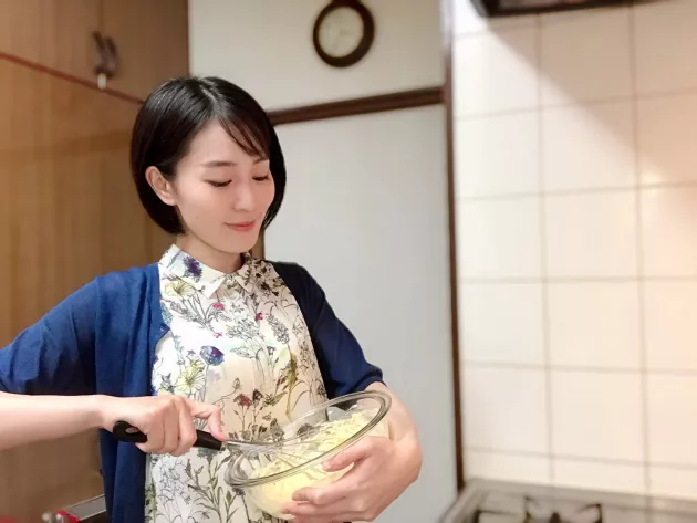 溶き卵を数回に分けて加え、分離しないよう混ぜていきます。