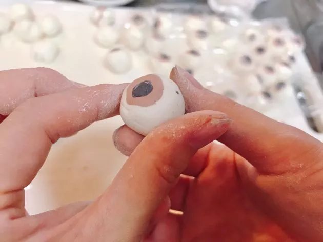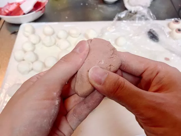 丸めた白い生地に、茶色と黒の生地を少量乗せて、くっつけます。