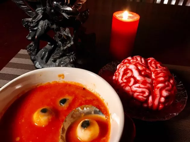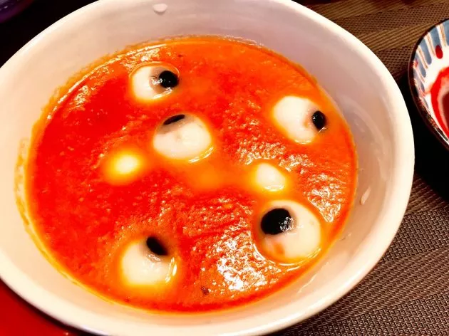 かなりグロいですが、これが食べられるなんてやっぱりワクワクです。まずは目玉スープからいただきます。