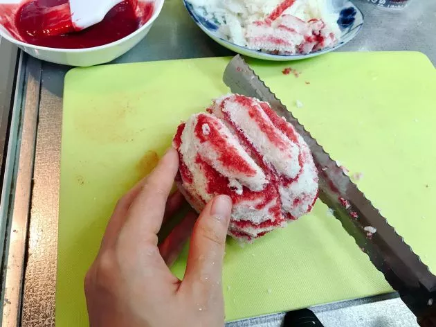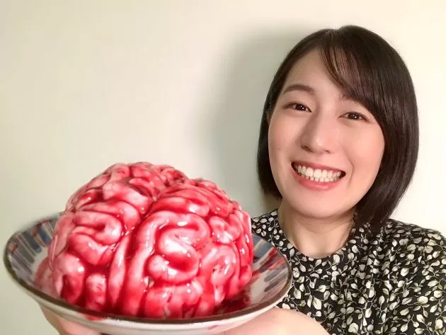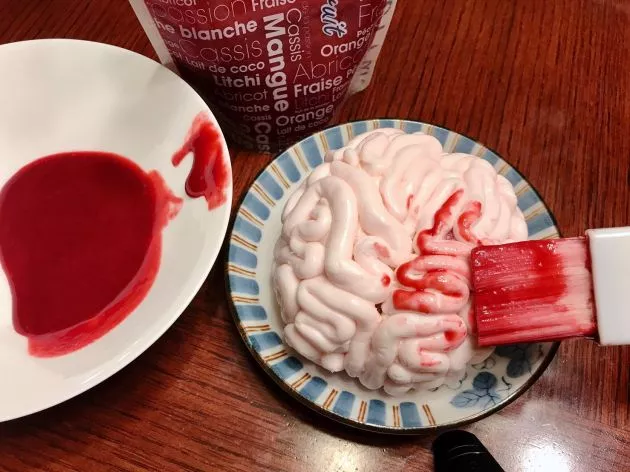 既に脳に見えますが、映画ではもっとジューシー(笑)な感じだったので、表面に血に見立てたラズベリーシロップを塗って仕上げます。