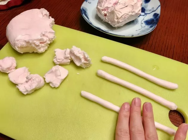 冷蔵庫で少し冷やして生地同士がくっついてきたら、右脳と左脳の間の溝を作ります。