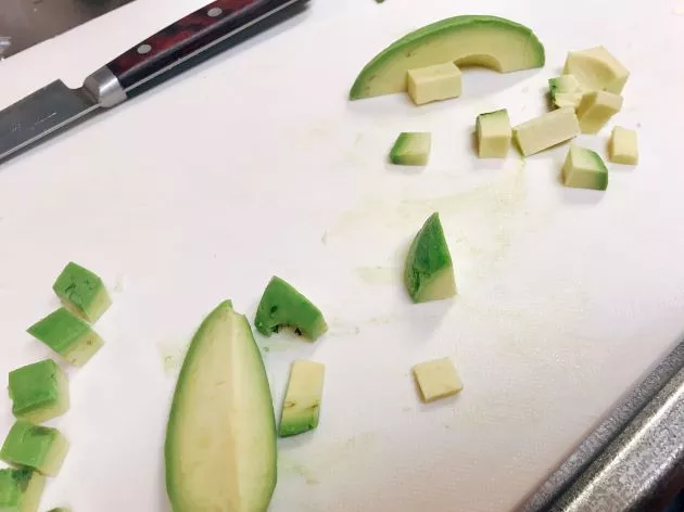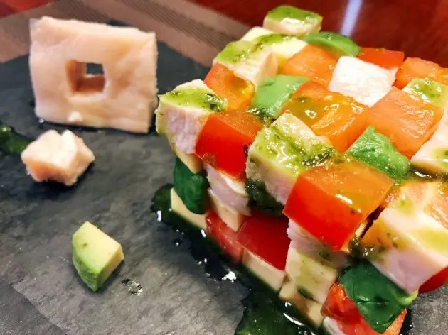 作り方は簡単!チーズ、アボカド、トマト、サラダチキンを1㎝角に切っていきます。