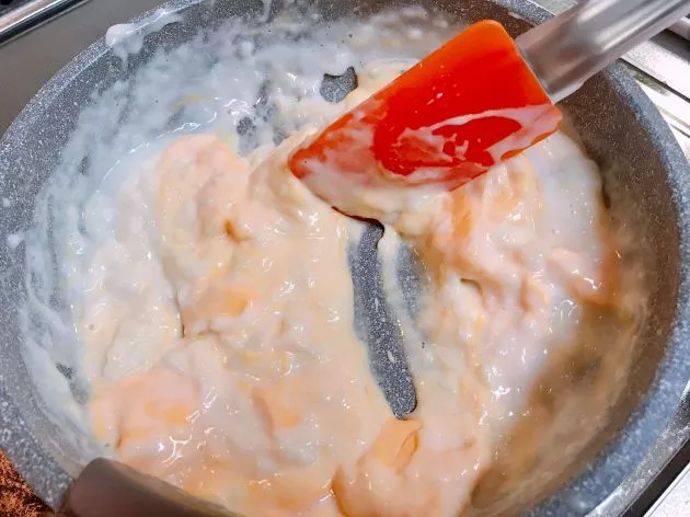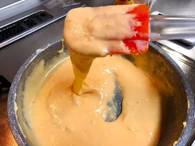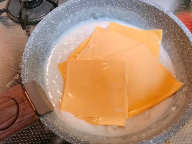 再び過熱しながらチーズを溶かし牛乳と混ぜていきます。