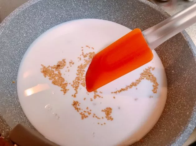 牛乳、片栗粉、コンソメを小さめのフライパンに入れ、粉をしっかり溶かしながら加熱していきます。