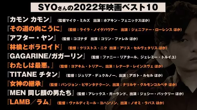 いろいろあった2022年の映画を総まとめしつつ、年末年始の映画鑑賞対策を教えてくれた今年最後の「どう見まSYO!」。そのなかでSYOさんは、悩みに悩んだ「2022年総まとめ ベスト10」を挙げてくれました。ラインナップを見ると、その人の趣味嗜好がなんとなくわかりますよね。基本的には、劇場映画でピックアップしてくれたベスト10。SYOさんの場合、真っ先にA24の作品が目に付きます(笑) 好きな映画は、たくさんあって『トップガン マーヴェリック』『NOPE/ノープ』『スパイダーマン:ノー・ウェイ・ホーム』は、もちろん好きですが、「僕が入れずとも皆さん入れるでしょう」ということで、番組内では、『その道の向こうに』『アフター・ヤン』『女神の継承』の3本を中心に語ってくれました。